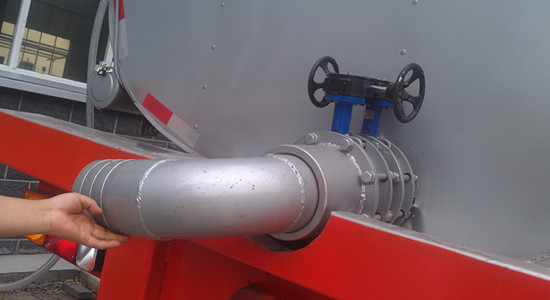沥青运输车的自流口装置可以选择如下图制作方式,带弯头的自流口,而且可以左右转动,这样方便卸料,左右卸料都不受影响。