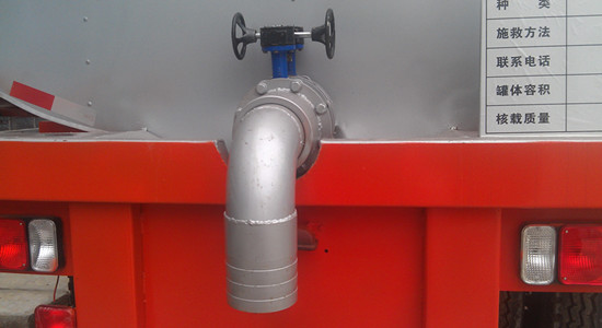 沥青运输车也叫液态沥青保温运输车,由于液态沥青介质比较粘稠,而且有一定的温度要求,所以排泄大多属于自流。一般沥青运输车自流装置在车辆的尾部,采用耐高温球阀控制。如下图。