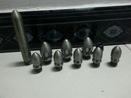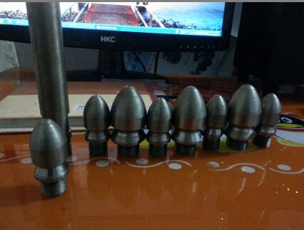 除了直喷头以外,每个喷头都有向后的6个喷射孔(一边穿透、破碎、搅拌堵塞物,一边推动喷头和耐高压水管前进),其中2、3、5、8号另外,还有一个前喷孔(穿刺堵塞物并作为导引孔)。