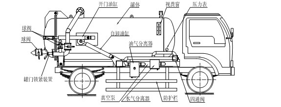 该车是由汽车底盘,取力器,传动轴,真空吸污泵,压力罐体,液压部分,管网系统,真家压力表,视粪窗,洗手装置等组成,随车配置大功率真空吸污泵和优质液压系统,